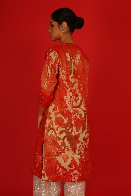 Red kurta featuring a floral vine hand-painted pattern and a round neckline