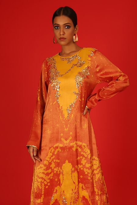 Orange Velvet Sequins, Embroidery Round Neck Ebru Hand Painted Kurta And Pant Set