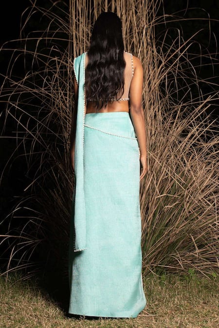 Blue pre-draped saree with banana tree embroidered motifs and attached pallu. Comes with embroidered blouse.