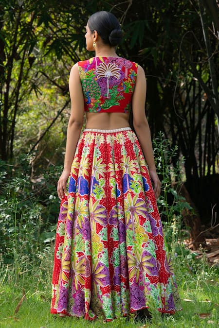 Red lehenga with floral printed motifs and embroidered waistband. Comes with blouse and organza dupatta.