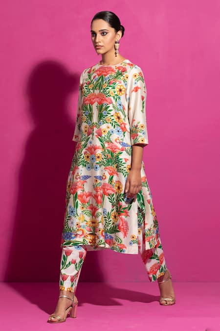 Multi color straight kurta featuring three fourth sleeves, stand collar neckline, and kali champa blossom print. Paired with tulip bloom print straight pant.