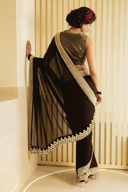 Black saree with hand embroidered border in metallic gold and pearls. Comes with hand embroidered unstitched blouse piece.