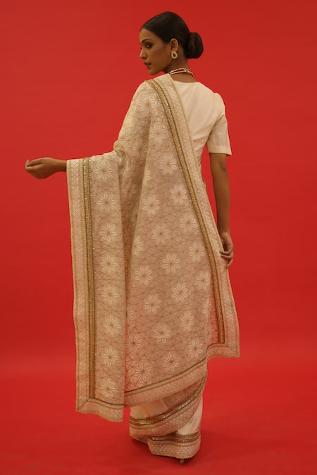 Ivory chanderi saree featuring mosaic jaal and resham applique hand embroidery. Comes with an unstitched blouse piece.