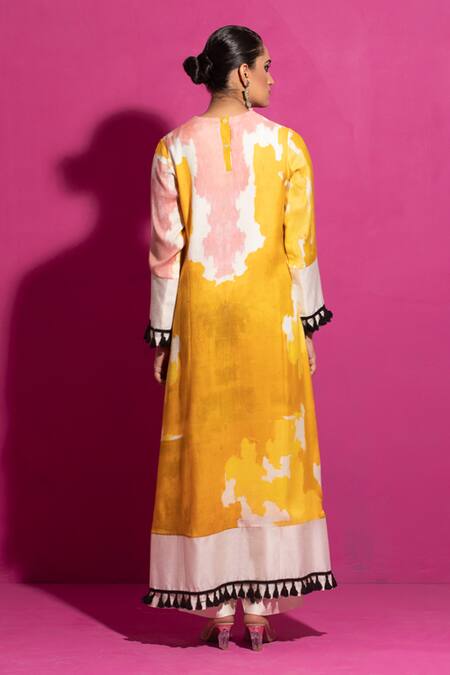 Yellow Cotton Satin Scoop Neck Abstract Print Asymmetric Kurta