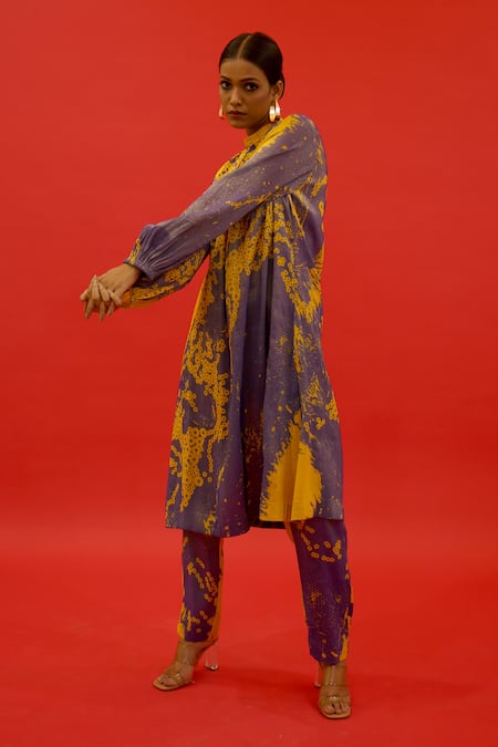 Yellow kurta featuring floral hand-painted motifs and puffed sleeves. Paired with straight pants for a complete look.