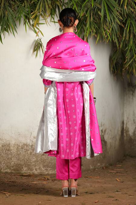 Pink chanderi A-line kurta featuring floral hand embroidery and a V-neckline. Paired with straight pants and a coordinating dupatta.