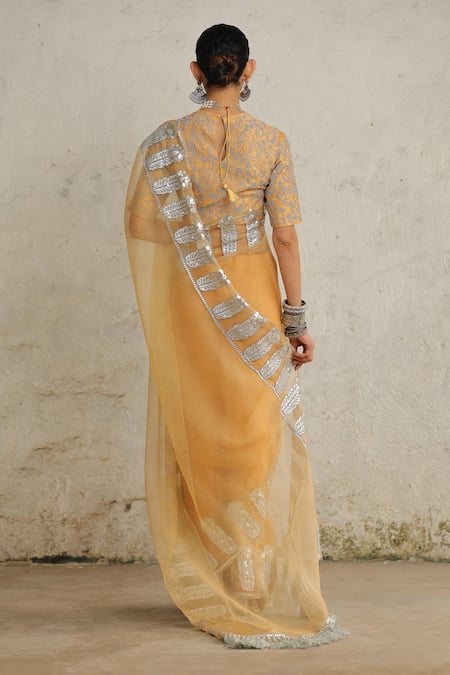 Yellow Organza Applique, Embroidery Collared Maharani Hand Saree With Blouse
