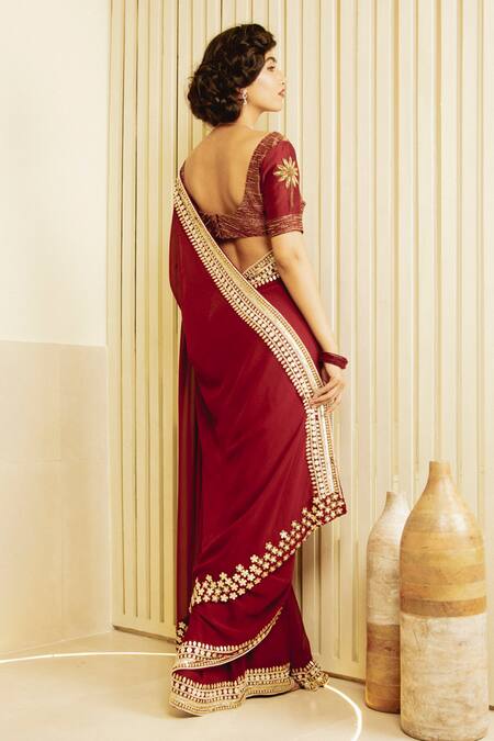 Maroon saree with hand embroidered border in metallic gold and pearls. Comes with hand embroidered unstitched blouse piece.
