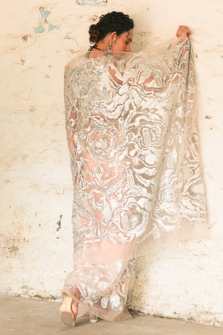 Peach hand embroidered saree featuring distressed metallic silver applique and aari work. Paired with a matching chanderi embroidered blouse and petticoat.