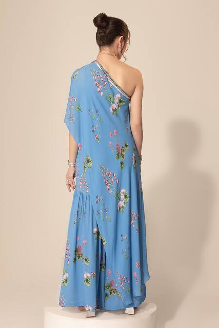Blue double georgette one-shoulder asymmetric tunic featuring botanical print with sequins, stones & beaded embroidered neckline. Paired with a coordinating sharara.