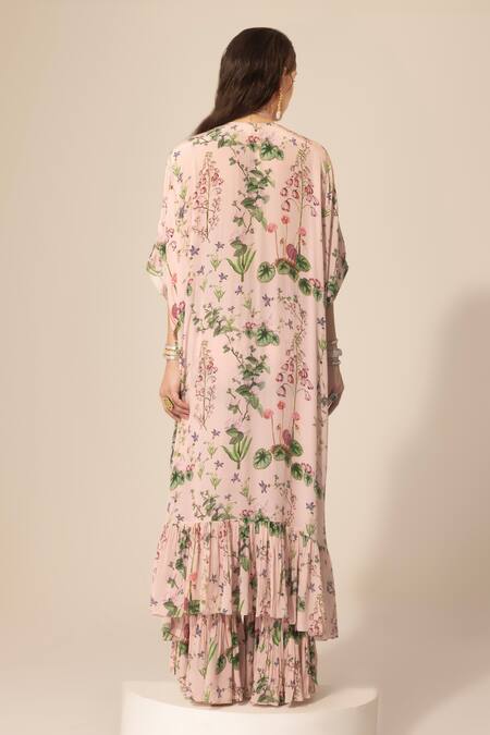 Blush pink kaftan featuring botanical print with sequins, stones, and beaded hand embroidery along the center front border. Paired with pleated straight pant for a complete look.