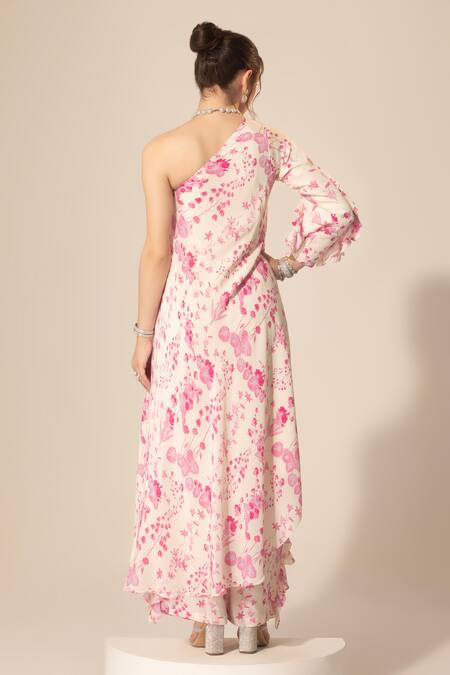 Ivory and pink crepe one-shoulder tunic featuring a botanical print, asymmetric drape, and ruffled slit sleeve. Paired with straight pants that have ruffled side slits.
