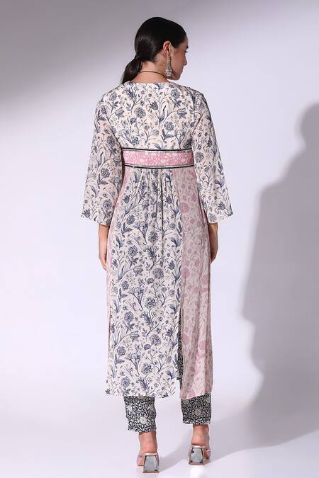 Pink kurta featuring a V neckline, three fourth sleeves, and panelled slits with all over dahlia bloom print. Paired with a navy blue floral printed bustier and straight pant.