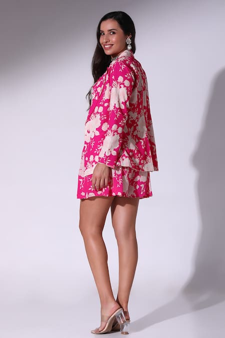 Pink Crepe Collared Floral Print Blazer Shorts Set