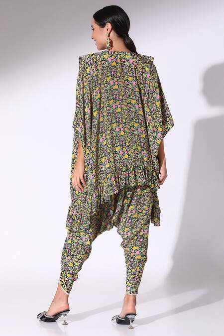 Black floral print kaftan style cape featuring batwing sleeves and a ruffled hemline. Paired with a matching bustier and draped dhoti pant with slit detailing.