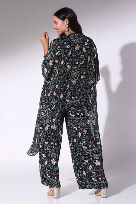 Black Chiffon, Crepe Pearls V-neck Gardenia Print Asymmetric Kaftan With Pant