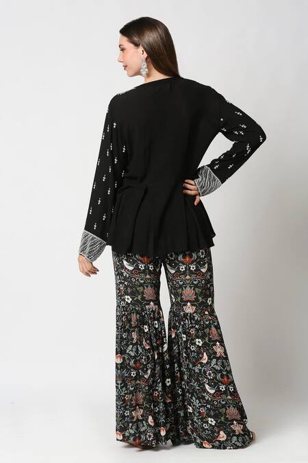 Buy_SAKSHI GIRRI_Black Wrinkled Cotton Notched Printed Kurta And Gharara Set_Online_at_Aza_Fashions