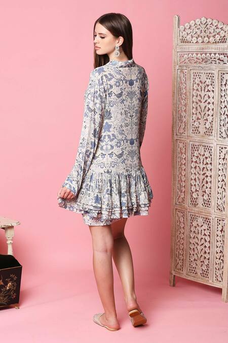 Ivory shirt dress with all-over floral printed motifs and layered ruffled hemline.