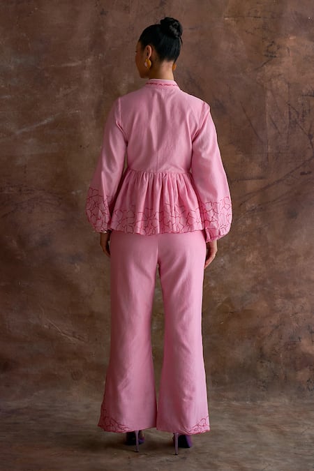 Pink peplum top featuring floral embroidery on the hemline and cuffs. Paired with bell-bottom pants with side slits.
