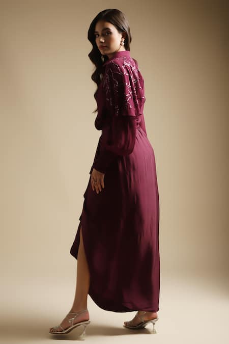 Wine Georgette, Satin One Shoulder Embroidered Shirt And Skirt Set