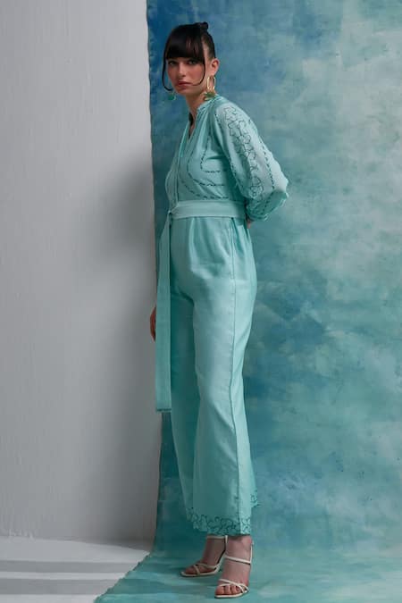 Blue chanderi jumpsuit featuring floral embroidered sleeves and slit hems. Comes with a matching belt for added style.