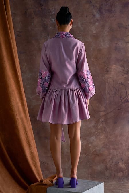 Purple chanderi shirt dress featuring floral, thread, and beaded hand embroidery on the collar and puffed sleeves