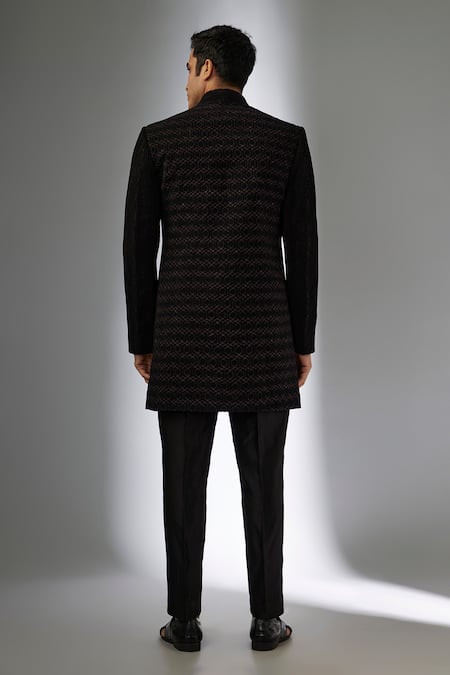 A black indowestern jacket in Japanese fabric features zari embroidery and a geometric pattern. It is paired with a black silk chanderi kurta and coordinating black pants.