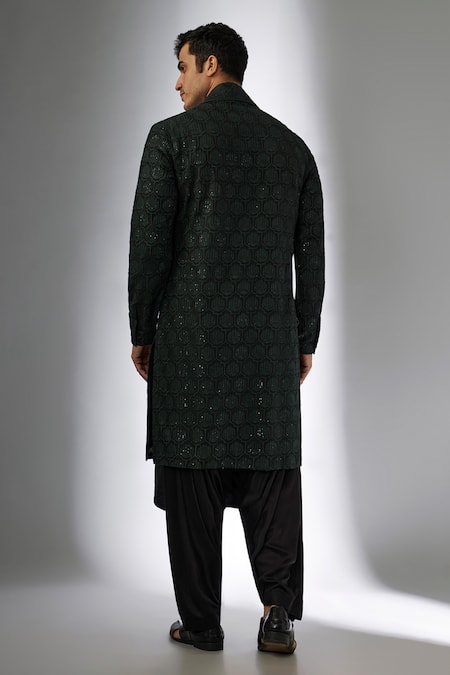 A dark green dola silk kurta featuring thread and sequins embellishments. It is paired with a modal satin cowl salwar pant and a matching stole.