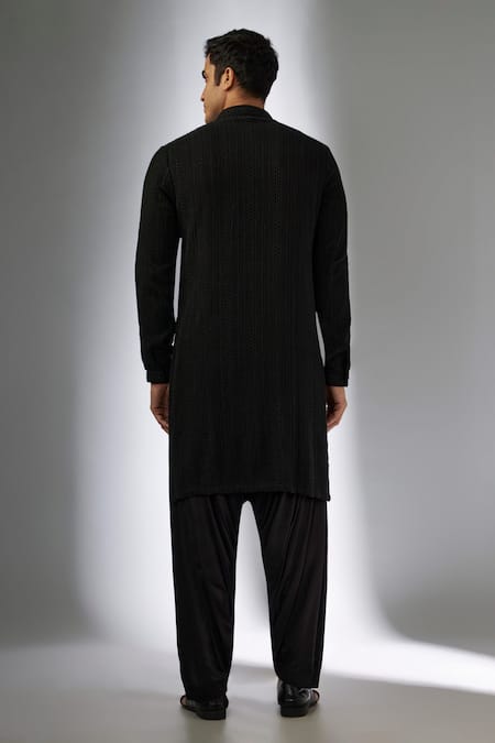 A black kurta in georgette base features intricate thread work and a mandarin collar with button placket. It is paired with a black modal satin cowl salwar pant.