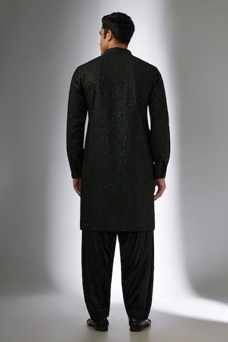 A dark green kurta in dola silk features thread and sequins embellishments with a band collar and full sleeves. It is paired with a black modal satin cowl salwar pant.