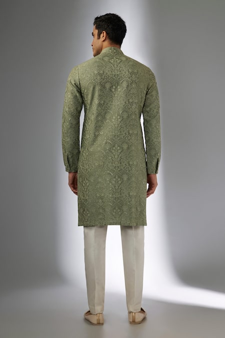 A sage green kurta crafted from silk chanderi features intricate thread and sequins embellishments. It is paired with an ivory pant.