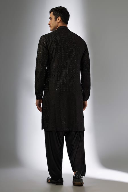 A black silk chanderi kurta is adorned with zari and sequin embellishments. It is paired with a modal satin cowl salwar pant.