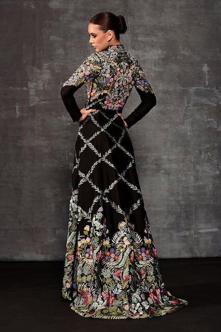 A longline black cotton silk jacket featuring a mandarin collar, full-length sleeves, and multicolor floral embroidery. It is paired with coordinating black cotton silk pants.