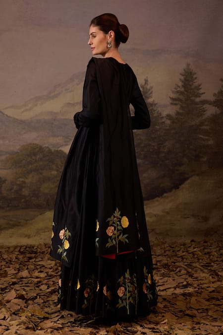 A black full-length anarkali featuring a round neckline, long sleeves, and vibrant floral embroidery along the hem.