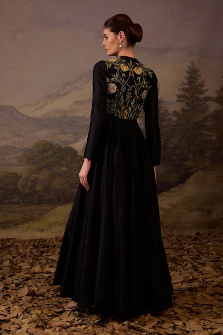 Black Cotton, Silk Embroidery, Metallic Thread High Neck, Floral Bodice Gown