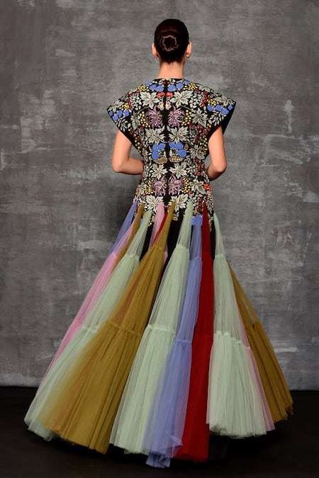 Vibrant multi-colored floral and butterfly embroidery on the bodice, Dramatic full-length skirt with tiers of rainbow-colored tulle