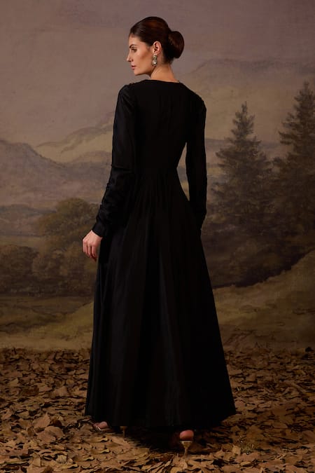 A black cotton silk gown with a V-neck bodice and long sleeves, featuring red and green floral embroidery on the neckline and bodice, and a flowing silhouette.