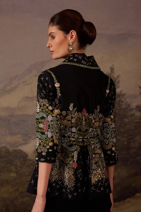 A black cotton silk jacket features intricate all-over botanical and geometric embroidery in gold and jewel tones, designed with a structured silhouette. It is paired with coordinating slim pants.