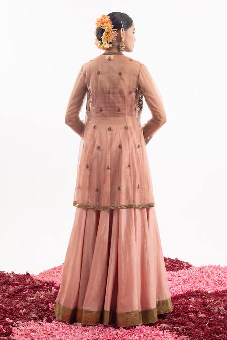 Peach Cotton, Silk Cut Work, Embroidery Open Neck, Floral Jacket Lehenga Set