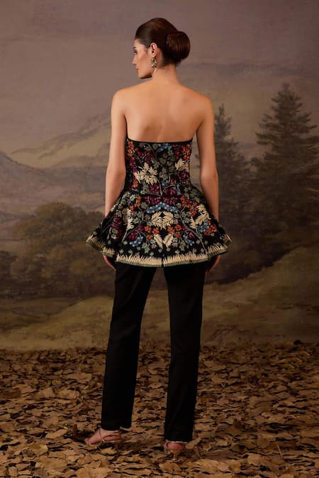 A black cotton silk strapless top featuring all-over floral embroidery and a peplum hem. It is paired with coordinating black cotton pants.