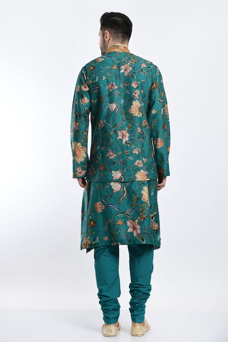 Green bundi featuring florette print and thread embroidery. Paired with a matching kurta and churidar.