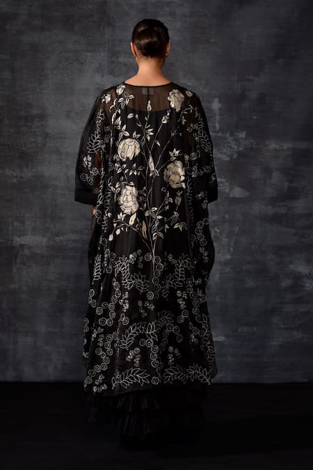 A black organza silk kaftan featuring intricate white and silver floral and botanical embroidery. It is paired with an inner black cotton dress.