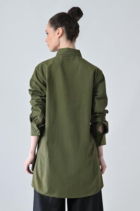 Olive pattern shirt made from cotton fabric featuring a collared neckline and button placket
