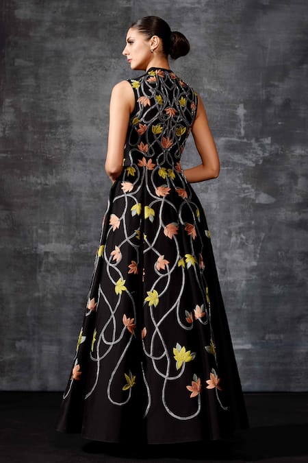Black Cotton, Silk Embroidery, Metallic Thread High Neck Sleeveless Floral Gown