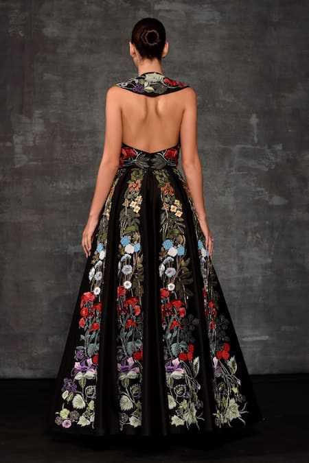 Multi-colored floral and botanical embroidery, Halter neck design, Backless detail