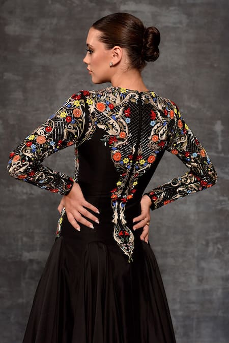 A black gown crafted from cotton silk, featuring an intricately embroidered long-sleeved top with colorful floral patterns.