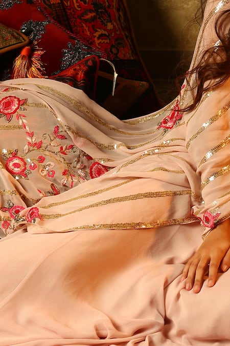 Blush pink anarkali with floral embroidered, sequin work attached dupatta.