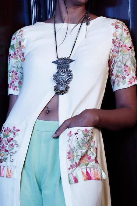 Cream front-slit kurta with resham multicolor floral embroidery on sleeves & front pockets with tassels. Paired with green palazzo.