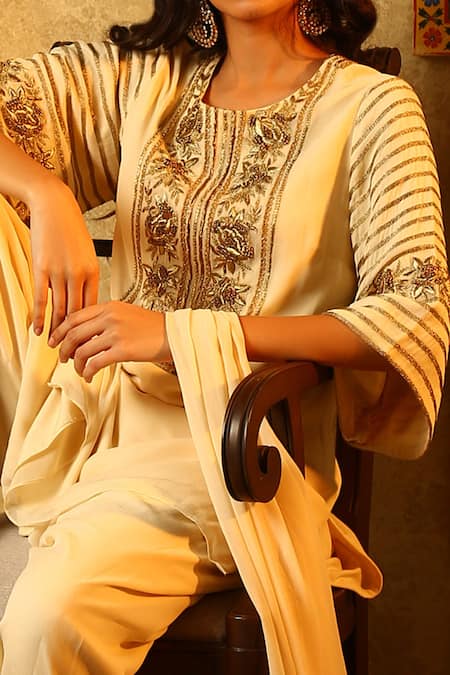 Beige kurta with floral embroidered motifs, striped detail & flared sleeves. Paired with salwar & frill dupatta.