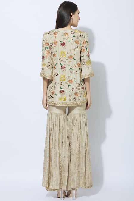 Ivory hued short kurta with all over floral bel motifs. Comes with sharara pants.